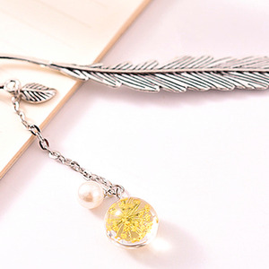 Beaded Gypsophila Dried Flower Vintage Feather Bookmark - Yellow